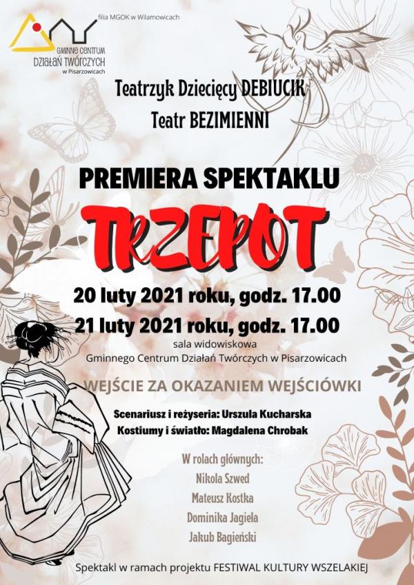 W dniach 20 i 21 lutego br. w Gminnym Centrum Działań Twórczych w Pisarzowicach, będącym filią Miejsko-Gminnego Ośrodka Kultury w Wilamowicach, odbyła się długo wyczekiwana premiera spektaklu „Trzepot” w wykonaniu Teatrzyku Dziecięcego DEBIUCIK i Teatru BEZIMIENNI. Był to pierwszy występ grup teatralnych, wystawiony na nowej scenie po modernizacji. Z powodu obostrzeń sanitarnych premierę rozłożono na dwa dni.