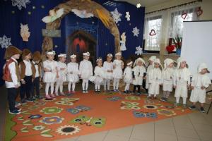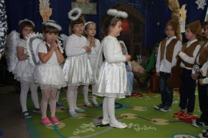 Repertuar spotkania najmłodszej grupy „Maluszków” obejmował: wierszyki, piosenki z układem tanecznym i piękne kolędy. Stosowne stroje pastuszków, owieczek i śnieżynek dodały uroku małym aktorom. Na koniec gromkie 100 lat zaśpiewały dzieci wraz z publicznością. Maluszki bardzo się zaangażowały, dały z siebie wszystko! Na pamiątkę spotkania goście zostali obdarowani okazjonalnym stroikiem z dołączonymi życzeniami i własnoręcznie odbitym paluszkiem.