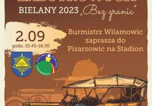 Burmistrz WILAMOWIC zaprasza do Pisarzowic na stadion gdzie 2 września 2023 odbędzie się Międzynarodowy XXII Rajd Pojazdów ZABYTKOWYCH - Bielany 2023 - "Bez Granic"