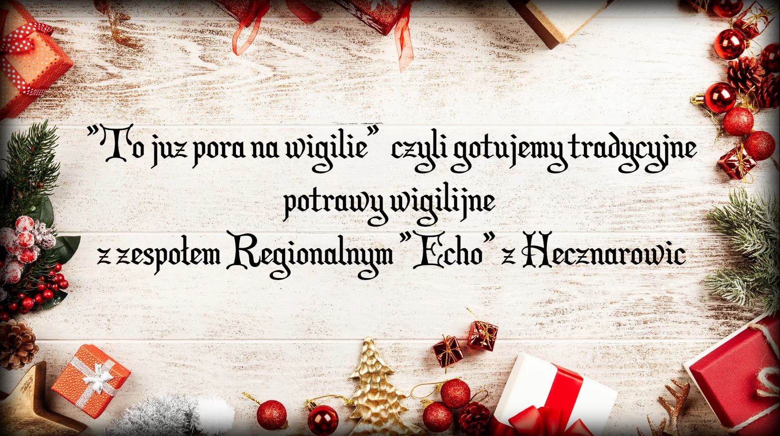 Co roku w okresie przedświątecznym panie z Zespołu Regionalnego „Echo” z Hecznarowic, którego również jestem członkiem, oraz KGW spotykały się ze swoimi koleżankami i sympatykami przy wspólnym wigilijnym stole. Niestety pandemia koronawirusa pokrzyżowała nam plany w tym roku. Obostrzenia nie pozwoliły na wspólne kolędowanie, ale za to wpadłyśmy na pomysł, by podzielić się z innymi naszymi kulinarnymi przepisami.