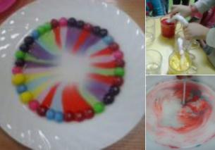 Dzieci układały kolorowe cukierki na talerzykach. Następnie na środek talerza nalewaliśmy wodę i po chwili smugi kolorów układały się w barwną tęczę.