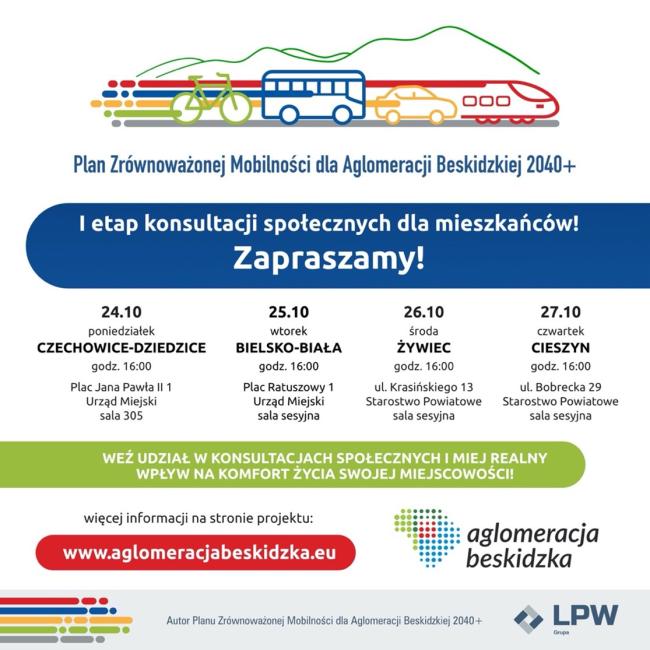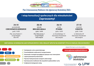 Już od 24 do 27 października zapraszamy mieszkańców do wzięcia udziału w pierwszym etapie konsultacji społecznych Planu Zrównoważonej Mobilności Aglomeracji Beskidzkiej.