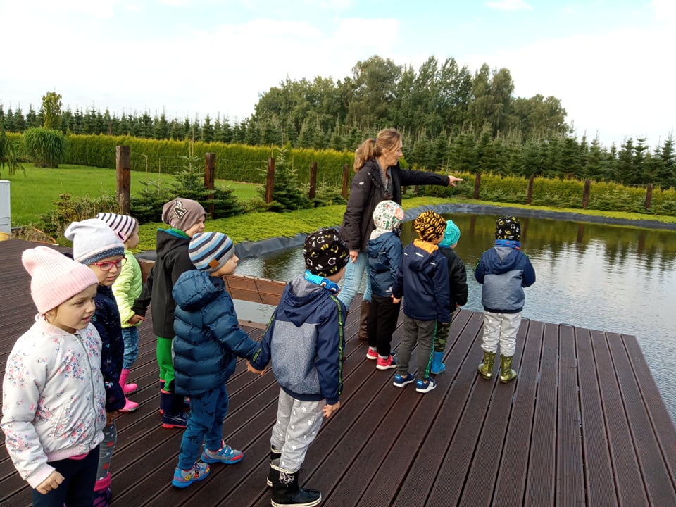 Głównym celem wycieczki było przybliżenie dzieciom środowiska przyrodniczego oraz zapoznanie ze zmianami zachodzącymi w świecie roślin na przełomie lata i jesieni. Przedszkolaki poznawały przyrodę, używając do tego różnych zmysłów. Oglądały drzewa liściaste - różne rodzaje klonów, dęby, lipy oraz drzewa iglaste -  sosny, świerki. Zobaczyły łąkę, na której widać coraz mniej kwiatów oraz mieniące się w słońcu różnymi barwami krzewy, takie jak berberysy, borówki amerykańskie, dzikie róże, itp. Dzieci zbierały różne dary jesieni- orzechy, żołędzie i szyszki, a nawet mogły posmakować borówek. Na przedszkolakach największe wrażenie zrobił duży staw z pięknym, drewnianym pomostem. Wycieczka do ogrodu i lasu nie tylko wzbogaciła wiedzę dzieci, ale  miała też walory zdrowotne. Ruch, świeże powietrze, malownicza przyroda sprawiły wszystkim wiele radości i dostarczyły niezapomnianych wrażeń. Na zakończenie, w podziękowaniu za możliwość wizyty w gospodarstwie, przedszkolaki podarowały pani Elżbiecie Mleczko piękną książeczkę „Praca ogrodnika oczami dzieci” z własnoręcznie przygotowanymi rysunkami. Bardzo dziękujemy państwu Mleczkom za miłe przyjęcie i zaproszenie na wiosnę.
