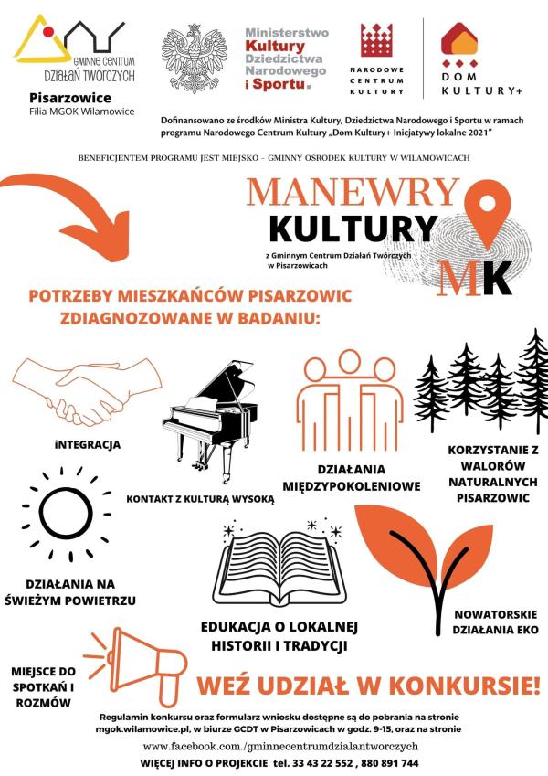10 czerwca br. w Gminnym Centrum Działań Twórczych w Pisarzowicach (filia M-GOK Wilamowice) miało miejsce spotkanie dotyczące przedstawienia raportu z diagnozy prowadzonej w ramach projektu "Manewry Kultury", omówienie założeń konkursu na inicjatywy kulturalne oraz warsztaty dla osób zainteresowanych konkursem. Wnioski zawarte w Raporcie można znaleźć w linku poniżej. Zapraszamy do lektury!