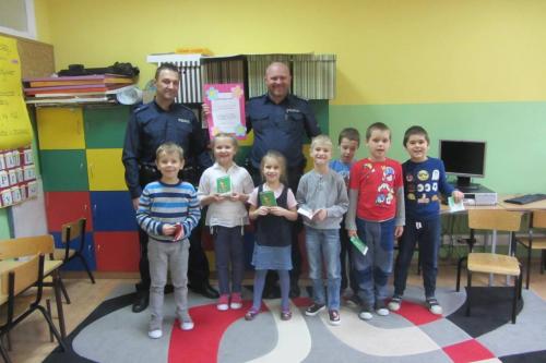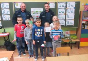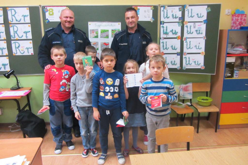Pierwszoklasiści mieli okazję porozmawiać z policjantami o zachowaniu bezpieczeństwa w drodze do i ze szkoły, na temat bezpiecznego przechodzenia przez ulicę, prawidłowego zachowania się podczas jazdy rowerem. Policjanci zwrócili uczniom uwagę na zapinanie pasów podczas podróży samochodem. Ponadto podkreślili, jak ważną rolę pełnią elementy odblaskowe, które każdy uczeń powinien nosić. Pierwszoklasiści z dużym zainteresowaniem słuchali rad i wskazówek zaproszonych gości i chętnie odpowiadali na zadawane pytania. Wykazali się wiedzą z zakresu bezpieczeństwa w ruchu drogowym i podawali liczne przykłady niewłaściwego zachowania się. Każdy z uczniów otrzymał na pamiątkę Kodeks drogowy. Na zakończenie wizyty uczniowie wręczyli policjantom podziękowanie.