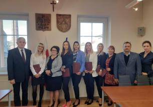 Po odebraniu od nauczycieli ślubowania, Burmistrz Wilamowic wręczył nauczycielom akty nadania stopnia nauczyciela mianowanego oraz listy gratulacyjne.