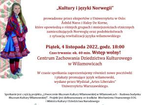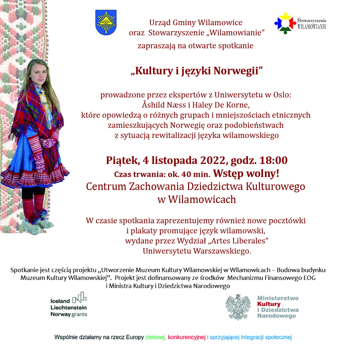 Urząd Gminy Wilamowice oraz Stowarzyszenie "Wilamowianie" zapraszają na otwarte spotkanie: "Kultury i języki Norwegii" prowadzone przez ekspertów z Uniwersytetu w Oslo: Åshild Næss i Haley De Korne, które opowiedzą o różnych grupach i mniejszościach etnicznych zamieszkujących Norwegię oraz podobieństwach z sytuacją rewitalizacyjną języka wilamowskiego.