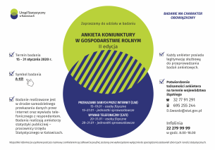 Urząd Statystyczny w Katowicach informuje, że w dniach od 15 stycznia do 31 stycznia 2020 r. zostanie przeprowadzone badanie ankietowe koniunktury w gospodarstwie rolnym (II edycja).