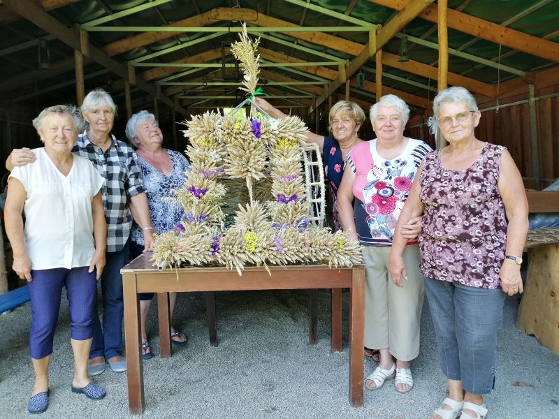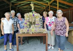 A zaczęło się tak... panie wraz z młodzieżą na początku lipca ścinały pszenicę i owies. Zboże to suszyło się z dala od gryzoni polnych. Była też lekcja koszenia zboża kosą i robienia snopków oraz stawiania babki. Następnie dzięki udostępnionym pomieszczeniom w Fest-Park przez dwa dni trwały warsztaty tworzenia wieńców dożynkowych pod czujnym okiem projektantki pani Urszuli Kucharskiej i przy jej ogromnej pomocy. Stelaż wykonał jak co rok nasz kolega Zbyszek. Warsztaty były nie tylko wspaniałą zabawą, śmiechem, „słodziutkimi ploteczkami”, ale wytężoną pracą, czasami też i w wielkim skupieniu. Zwinne paluszki pań plotły warkocze, robiły bukieciki, wiązały, splatały i dobierały kolorystykę. Czasami tę ciszę zakłócało gdakanie kur, zwłaszcza kiedy dumna kura zniosła jajko oznajmiając to całemu światu. Była to też wspaniała lekcja dla młodzieży. Typowa wiejska sielanka.