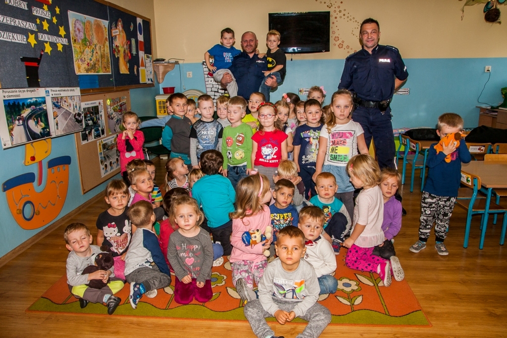 W piątek 10 listopada br. na parking naszego przedszkola podjechał policyjny radiowóz. Wysiedli z niego aspirant sztabowy Maciej Matusiak oraz młodszy aspirant Artur Prochownik.