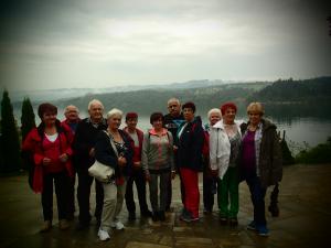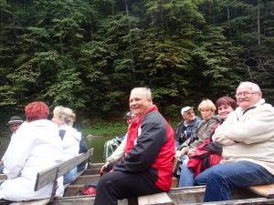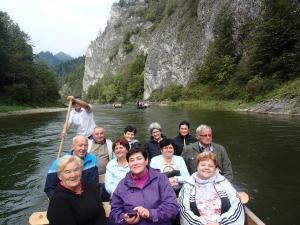 Drugi dzień to czas gdzie z przystani flisackiej wyruszyliśmy w niezwykłą podróż. Większość trasy przebiegała wzdłuż granicy polsko-słowackiej, która jest ustanowiona na rzece. Mijaliśmy w towarzystwie pływających kaczek i wędkarzy Macelową Górę u podnóża której Dunajec odsłonił zbudowaną z wapieni Białą Skałę. Po stronie słowackiej pokazał nam się cypel Urbanek i Sromowce Średnie. Wkrótce Dunajec podzielił się na dwa koryta i płynęliśmy w ciszy i ciekawym przekazywaniu informacji od flisaka. W szumie wód Dunajca mijaliśmy przepięknie położone wsie Sromowce Niże i Czerwony Klasztor (po stronie słowackiej) z zabytkowym klasztorem kartuzów i kamedułów z XIV wieku. Po chwili przed naszymi oczyma ukazał się przepiękny widok, a to najpiękniejszy i najwyższy szczyt Pienin Właściwych - Trzy Korony. Następnie wpłynęliśmy na przewężenie zwane Zbójnickim Skokiem - najwęższy punkt w całym przełomie. Według legendy przekazywanej nam przez flisaka, to w tym miejscu Janosik uciekał węgierskim żandarmom przeskakując na drugi brzeg. Wody Dunajca opłynęły razem z nami Górę Klejową , gdzie wyłonił się masyw Golicy, a na jej zboczach zobaczyliśmy Siedmiu Mnichów. I tak kolejno minęliśmy Skałę Facimiech, Wilczą Skałę i Sokolnicę z charakterystyczną sosną na wierzchołku. Ze śpiewem (ale niezbyt głośnym) nasza tratwa, wpłynęła na tzw. Bystry Prąd, by po chwili płynąć Dunajcem o największej swojej głębokości. Po pokonaniu kolejnego łuku minęliśmy słowacką przystań flisacką, gdzie kończy się granica obu państw, którą dotąd wyznaczał Dunajec. Nasza podróż w cudownej ciszy, szumie wód Dunajca, krajobrazie polskiej złotej jesieni, dobiegała końca. Minęliśmy jeszcze kamienne wrota Przełomu Dunajca, Hukową Skałę i Białą Skałę. Dopłynęliśmy do przystani w Szczawnicy. Po pysznym obiedzie, lodach, kawie, zwiedzaniu parku uzdrowiskowego w Szczawnicy udaliśmy się w drogę powrotną do Pisarzowic.