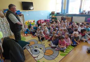 Pan leśnik wyjaśnił dzieciom na czym polega jego praca. Nadzoruje on życie lasu, zarówno zwierząt i roślinności. Opowiedział o etapach wzrostu drzewa począwszy od małego nasionka. Gość zobrazował zwierzęta żyjące w lesie demonstrując przedszkolakom barwne ilustracje m.in. wilka, sarny, zająca, niedźwiedzia, jelenia, jeża, dzika, bobra. Ciekawostką były zagadki słuchowe w postaci okazów pluszowych ptaków: dzięcioła, sowy, wróbla, drozda i innych. Dzieci dowiedziały się o sposobach dożywiania ptaków w okresie zimowym oraz odpowiedniego zachowania podczas pobytu w lesie.