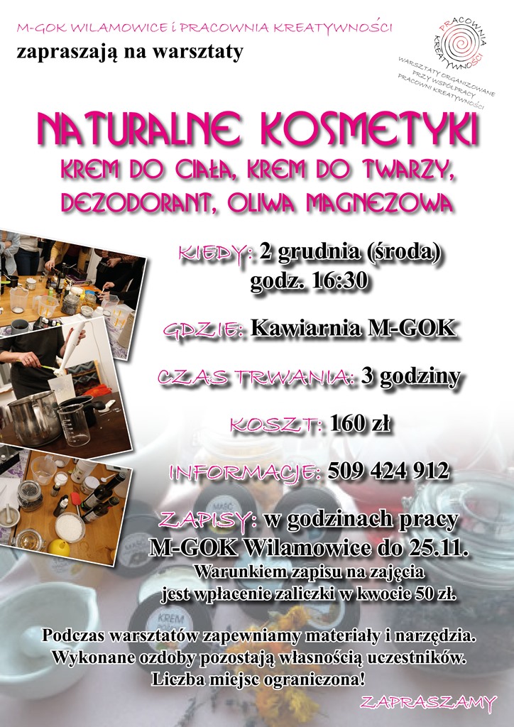 Zapraszamy na warsztaty!!! Naturalne kosmetyki - Krem do ciała, krem do twarzy, dezodorant, oliwa magnezowa