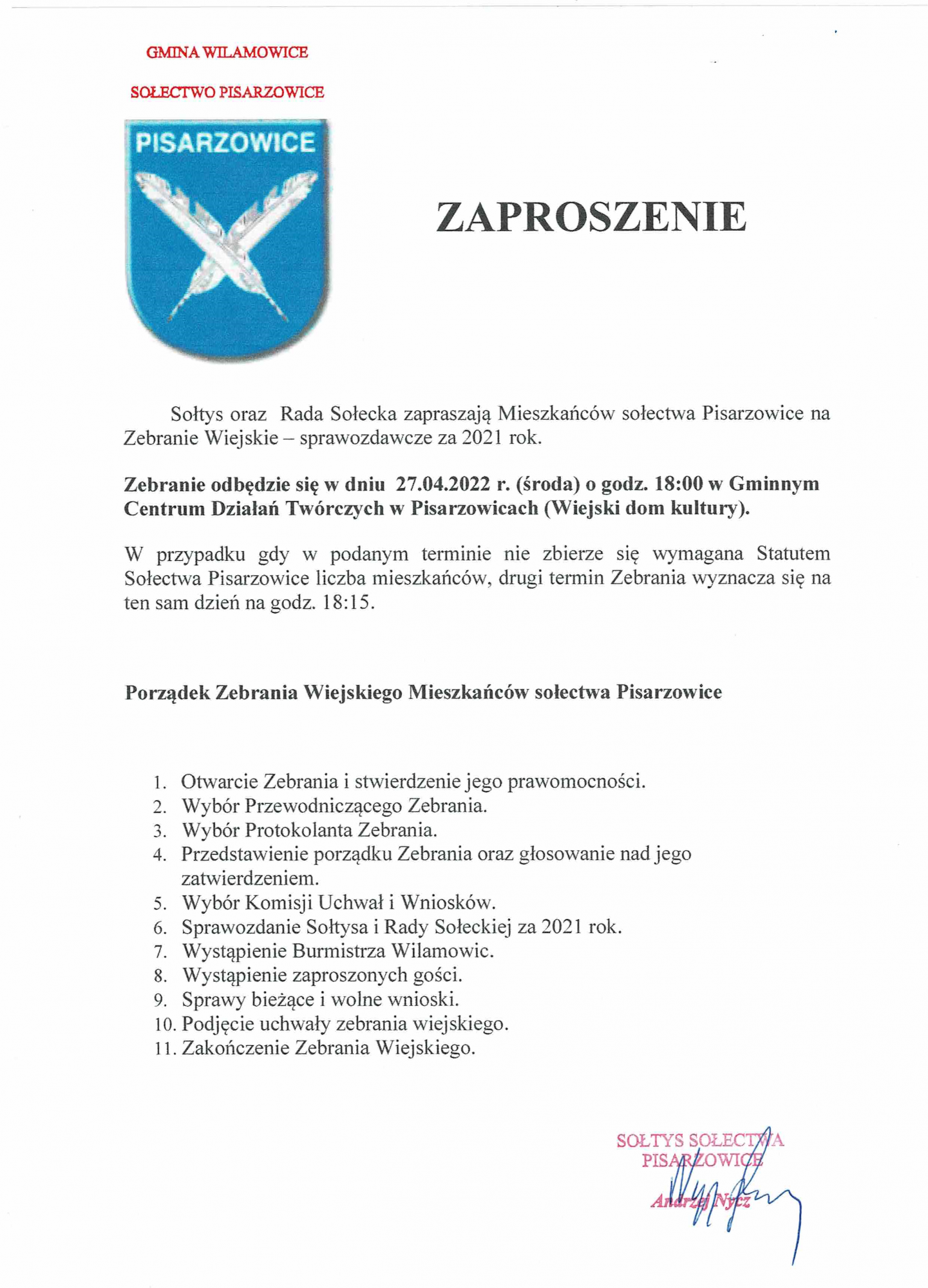 Zaproszenie - Zebranie Wiejskie - Pisarzowice
