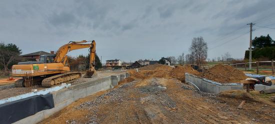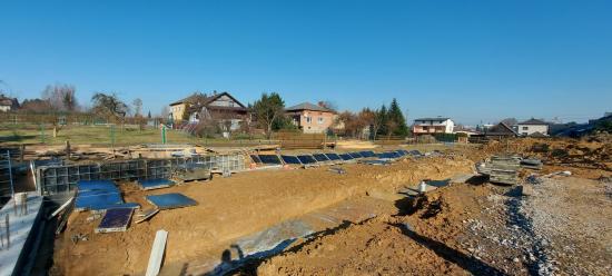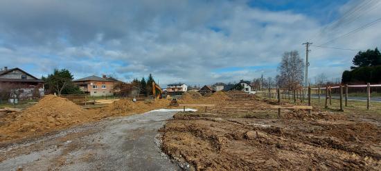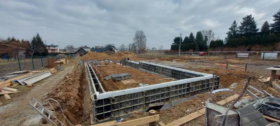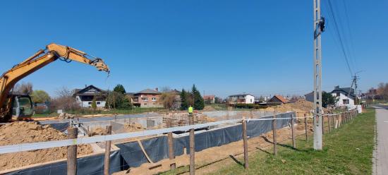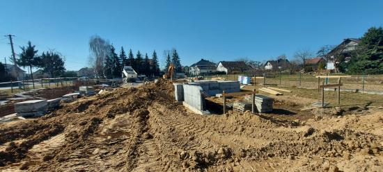 W miesiącu lutym przekazano Wykonawcy plac budowy, wytyczono geodezyjnie budynek oraz zabezpieczono teren ogrodzeniem. Trwają prace ziemne związane z wykonywaniem fundamentów budynku. Dokonano zdjęcia wierzchniej warstwy ziemi – humusu oraz rozpoczęto szalowanie i betonowanie fundamentów.